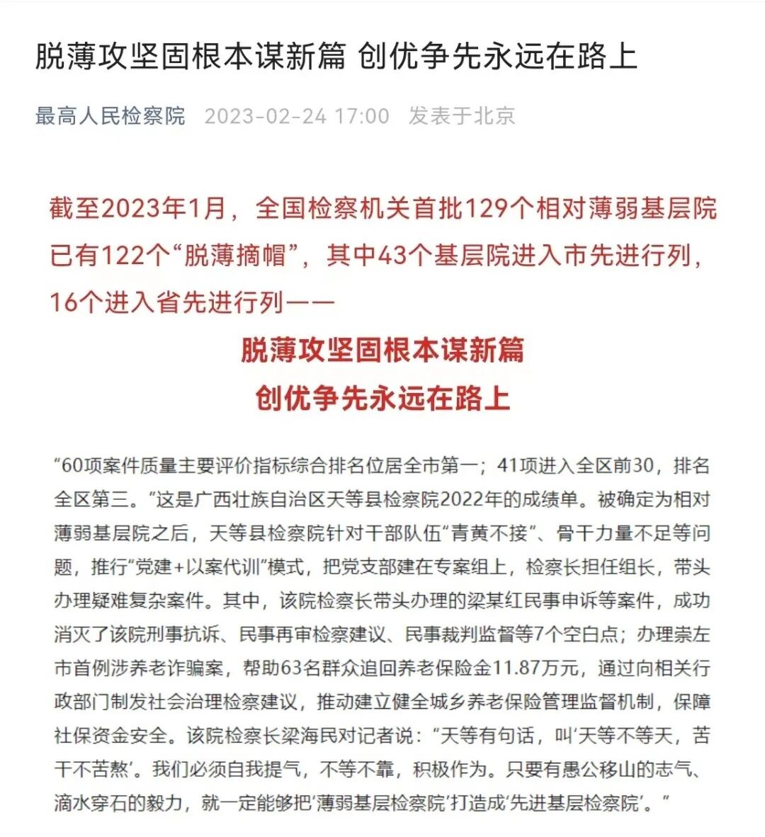 “天等有句话,叫'天等不等天,苦干不苦熬'。我们必须自我提气,不等不靠,积极作为。只要有愚公移山的志气、滴水穿石的毅力,就一定能够把'薄弱基层检察院’打造成"先进基层检察院’。”